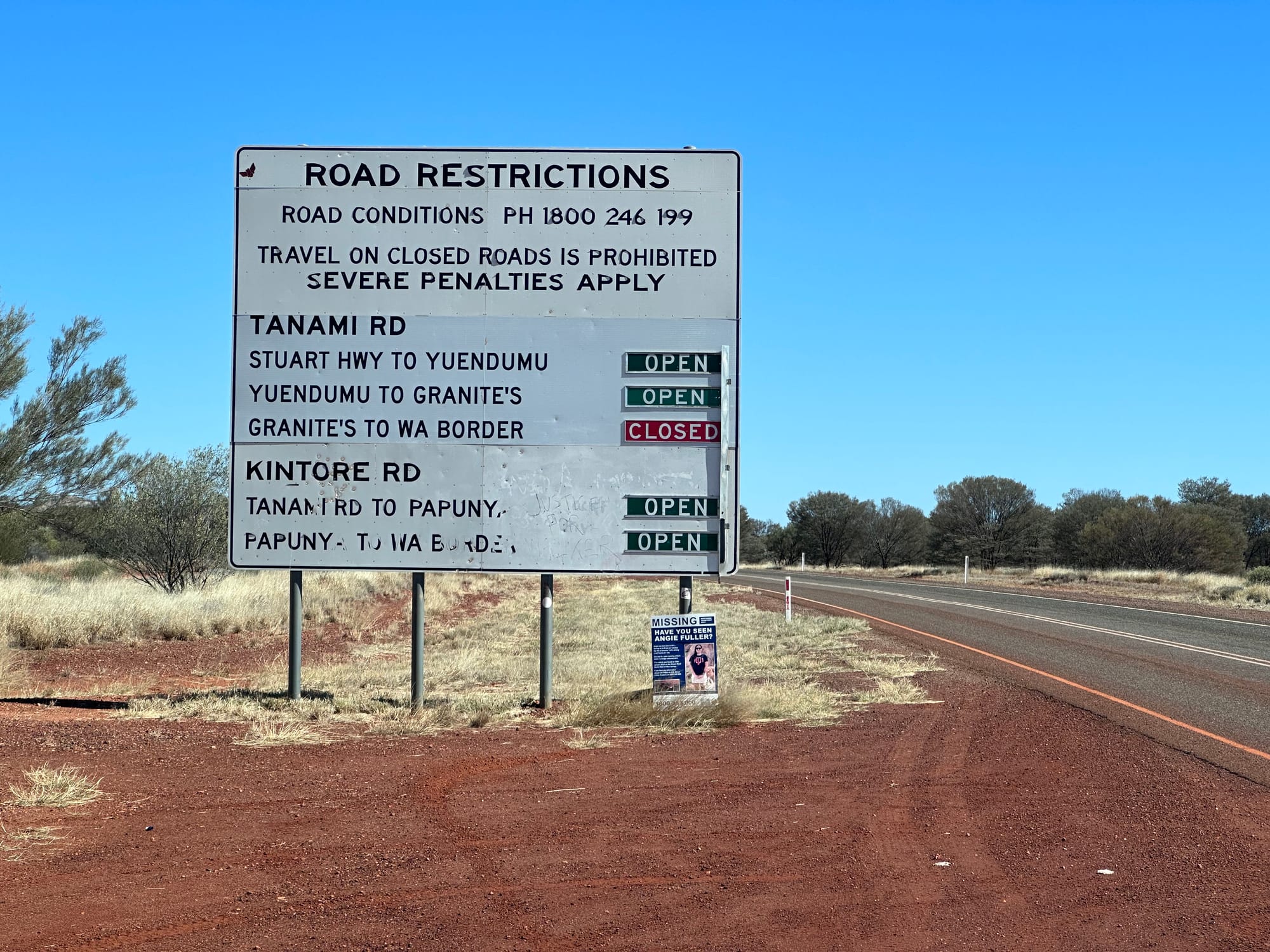 The trip didn't go to plan, as we had intended to conquer the 1,000km long Tanami Track from Alice Springs (NT) to Halls Creek (WA). When we arrived at the start of the Tanami Track, we were confronted by a sign advising that the track was closed between the Granites and WA Border (bugger).